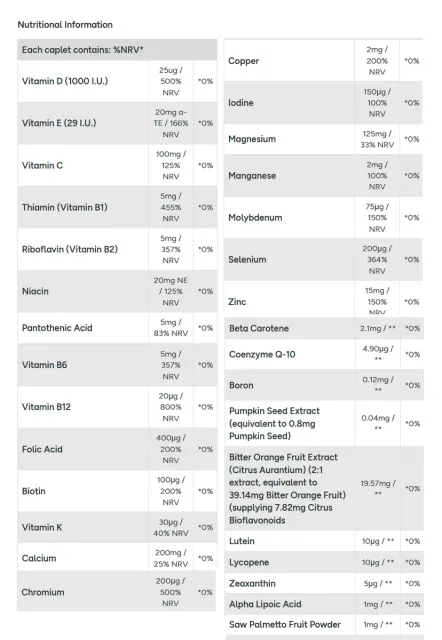 This multivitamin formulation delivers essential vitamins at moderate doses, with vitamin D3, vitamin A, and B-complex vitamins as primary contributors to nutritional support. The inclusion of clinically relevant forms such as D3 (cholecalciferol) and methylfolate-capable dosing suggests a focus on bioavailability and metabolic utility.