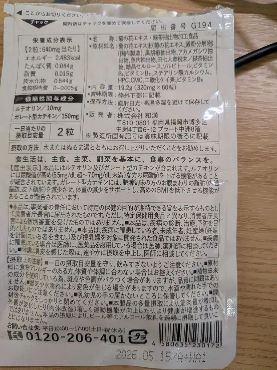 菊の花&カテキンの恵み by 和漢 combines luteolin, derived from chrysanthemum flowers (菊の花), and green tea catechins, particularly epigallocatechin gallate (EGCG), into a nutraceutical blend targeting oxidative stress, neuroinflammation, and cardiovascular health. The product positions luteolin as a key neuroprotective agent, drawing from its ability to cross the blood-brain barrier and modulate pathways involved in Alzheimer’s and Parkinson’s disease in pre-clinical models. However, the 10 mg dose falls far below the 50–100 mg range used in animal and mechanistic studies, limiting its likely clinical impact.