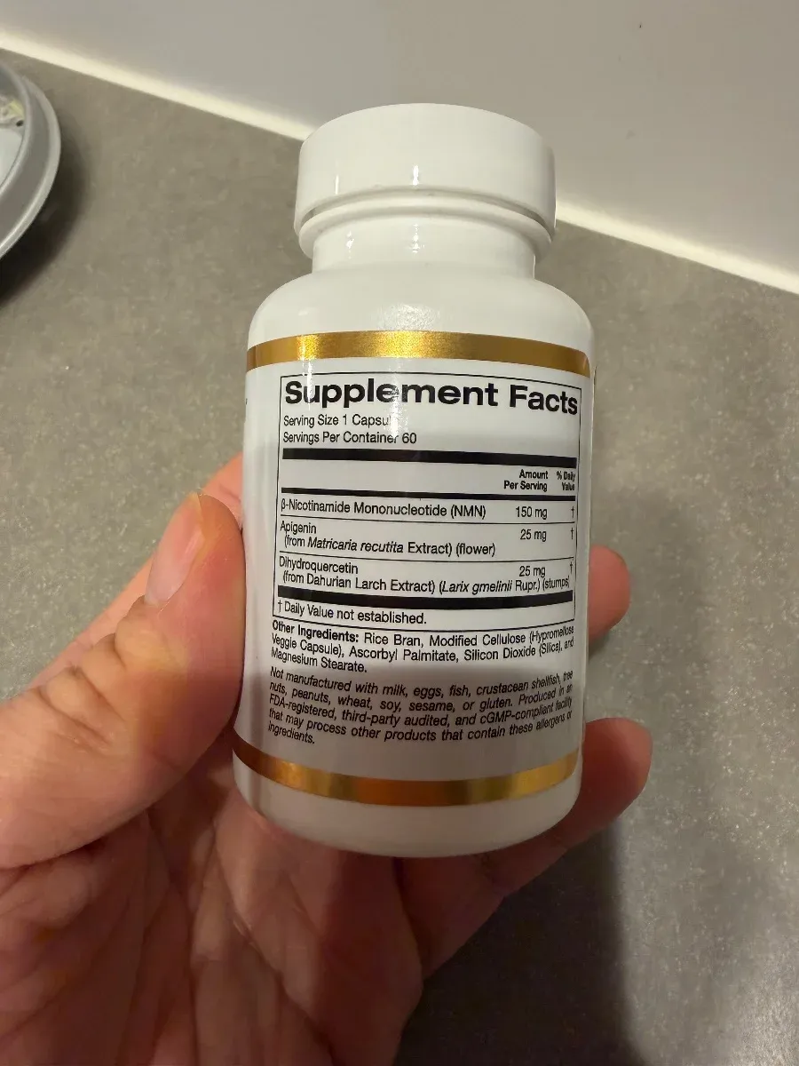The formulation centers on NMN as the primary active ingredient, supported by two flavonoids—apigenin and dihydroquercetin—that provide complementary antioxidant and anti-inflammatory effects. While NMN drives the core biological activity, the flavonoids are included at levels likely too low to exert standalone clinical effects but may contribute to overall cellular protection.