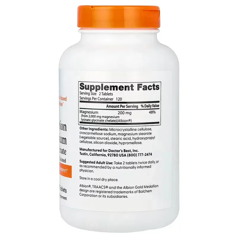 Doctor's Best Magnesium Lysinate Glycinate Chelate delivers 200 mg of elemental magnesium per capsule in a chelated form that enhances absorption and reduces the risk of gastrointestinal side effects such as diarrhea. Clinical evidence indicates that magnesium supplementation, particularly in bioavailable forms like glycinate, can improve metabolic parameters—including blood pressure and HDL-cholesterol—especially in individuals with baseline deficiency or metabolic syndrome [1][2][3]. This product aligns with therapeutic dosing strategies used in research, though higher or multiple servings may be needed to reach full clinical doses.