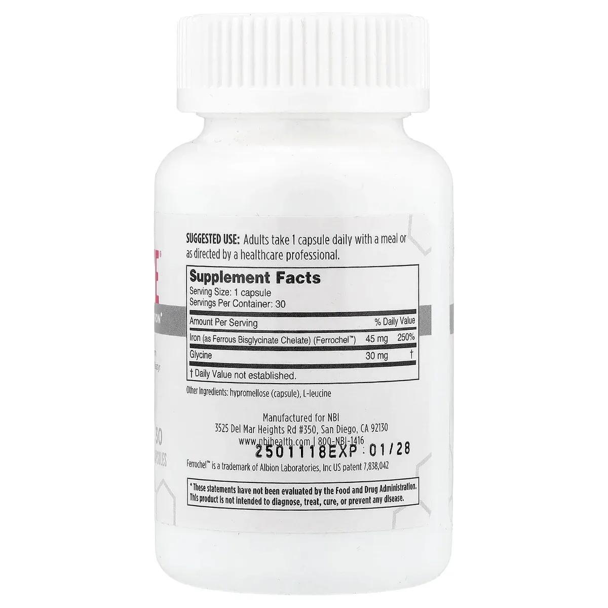 Ferrosolve®, High Potency by NBI is a targeted iron supplement formulated to correct iron deficiency, a condition affecting over 1.2 billion people globally [1]. The primary active ingredient, iron, is provided at 45 mg per serving, positioning it within the therapeutic range for treating iron deficiency anemia (IDA) in adults. This dose exceeds the Recommended Dietary Allowance (RDA) for most populations but aligns with clinical guidelines for IDA management, which recommend 100–200 mg/day of elemental iron, often divided into multiple doses.