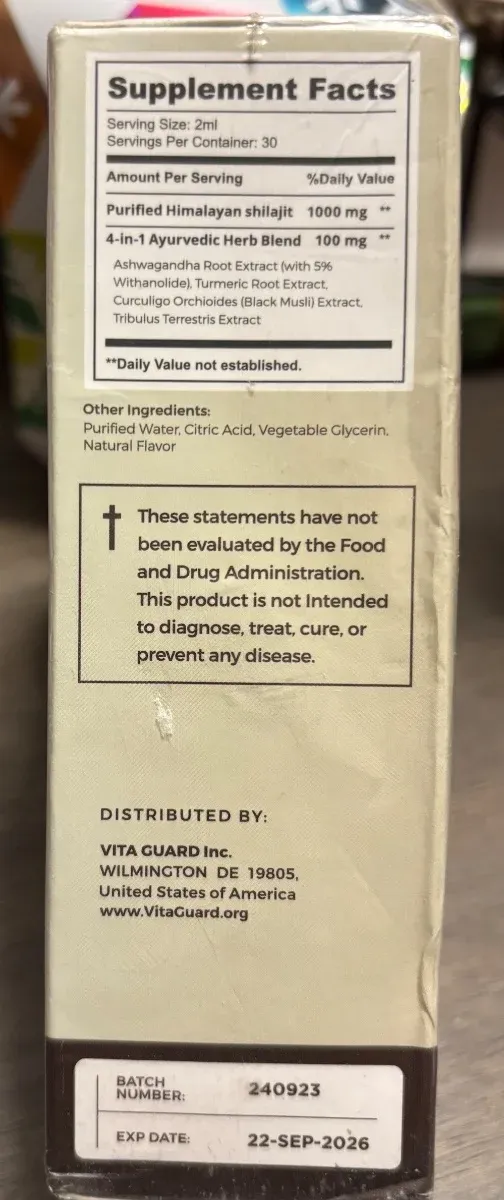 Vita Guard's Shilajit Liquid Drops is a dietary supplement formulated around shilajit, a mineral-rich resin traditionally used in Ayurvedic medicine for its rejuvenating and energy-enhancing effects. The product delivers 1000 mg of shilajit per serving, which aligns with the upper end of doses studied for cognitive and fatigue support (500 mg/day) and male fertility (250 mg twice daily). Shilajit contains fulvic acid and dibenzo-alpha-pyrones, compounds implicated in mitochondrial function and antioxidant activity, though clinical evidence remains limited and heterogeneous due to variability in sourcing and standardization [1][2].